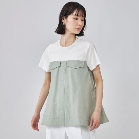 ビスチェを重ねたようなデザインに、ワークテイストのディテールを取り入れたコンビカットソー。
