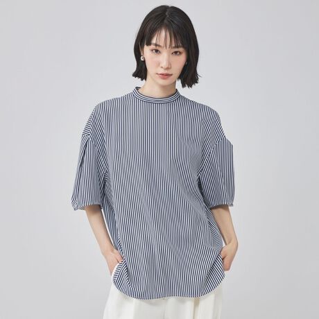 【バックボタンが映える ストライプデザインブラウス】