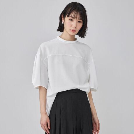 大きなタックを入れた立体的な袖フォルムと、胸元にさりげなく効かせた配色ステッチにより、