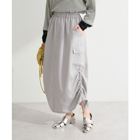 光沢サテンで魅せる上品カジュアルカーゴスカート上品な光沢感が魅力のサテン素材を使用したカーゴデザインのスカートです。カジュアルな印象のカーゴポケットに、なめらかなサテンの質感を組み合わせることで、程よく大人らしい上品カジュアルなスタイルを楽しめます。サイドにはドローストリングを取り入れており、絞り具合によってシルエットの変化を楽しめるのもポイントです。自然なギャザーが生まれることで立体感のあるフォルムになり、コーディネートに動きと表情を加えてくれます。縦のラインを意識したシルエットが全体をすっきり見せてくれるため、スタイルアップ効果も期待できます。ウエストは程よくフィットするデザインで、快適な着心地を保ちながらきれいなラインを演出します。カジュアルにもきれいめにも合わせやすく、日常のお出かけからリラックスシーンまで幅広く活躍する一着です。透け感[なし]