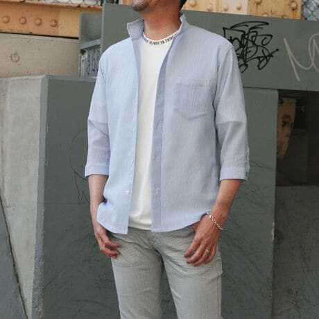 衿端にワイヤ−を仕込んだ七分丈ショートスタンドカラ−シャツ。衿端にワイヤーを入れることで襟を寝かせたり立てたりすることでスタイリングの幅を広げられるデザインとなっています。
