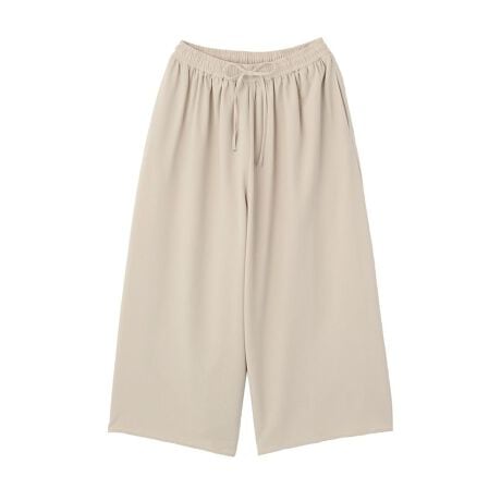 軽やかに着こなす上品カジュアルガウチョ動きやすさと上品な雰囲気を兼ね備えたワイドガウチョパンツです。ゆったりと広がるシルエットが足さばきを軽やかにし、リラクシングな着用感を実現します。ウエストゴム仕様で快適なフィット感があり、長時間の着用でもストレスを感じにくいのが魅力です。ドローストリングがさりげないアクセントとなり、カジュアルな中にも洗練された印象をプラスしてくれます。イージーケア素材を使用しているためシワになりにくく、お手入れが簡単で日常使いにもぴったりです。シンプルなデザインなのでシャツやカットソー、ブラウスなど幅広いトップスと相性が良く、きれいめカジュアルからリラックススタイルまで自在に着回しが楽しめます。デイリーコーデに自然と馴染む使い勝手の良い一本です。透け感[なし]