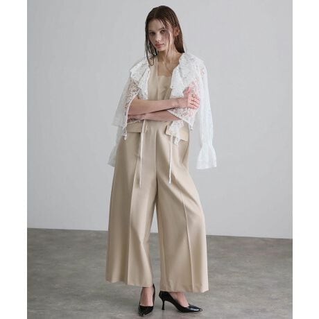 繊細なレースブラウスとオールインワンを重ねた、上品なレイヤードスタイル。