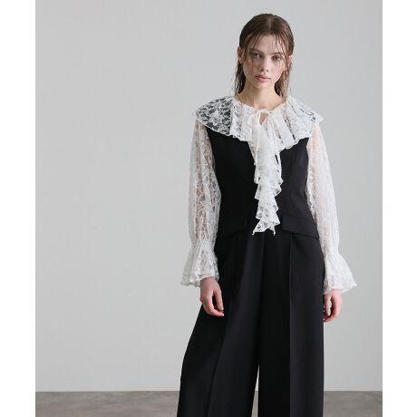 コードレースのブラウスにフロントラッフルをあしらい、顔周りを華やかに演出。