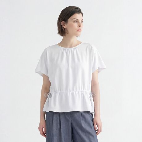 生地に高級感をプラスするシルケット加工のコットン素材で仕上げたカットソーです。衿元のギャザーが作るドレープがポイント、裾の両サイドのリボンをブラウジングすることでシルエットにふんわりと変化を付けられます。袖口のデザインにもさりげないこだわりをプラス、Tシャツ感覚で着られてコーデに差が付くアイテムです。