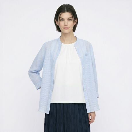 肌にさらっと心地よく着られるリネン100%素材のシャツです。これからの季節にぴったりの爽やかなストライプ柄、顔まわりをすっきりと見せてくれるバンドカラーで仕上げました。1枚着はもちろんボタンを開けて羽織りとしてあわせるのもおすすめ、ロングシーズンお使いいただける7分袖もポイントです。