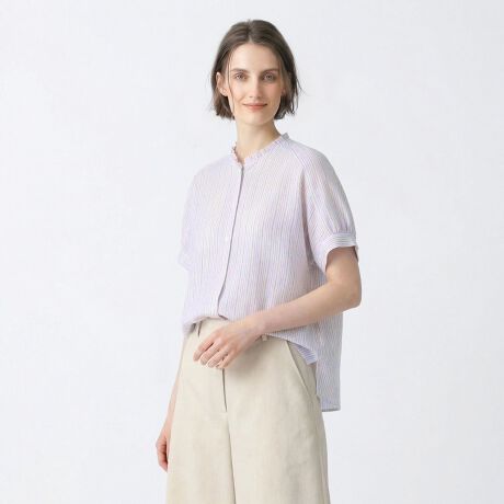 肌にさらっと心地よく着られるリネン100%素材のブラウスです。これからの季節にぴったりの爽やかなストライプ柄、顔まわりをすっきりと見せてくれるバンドカラーはフリルで大人可愛くおめかししました。ふんわりボリューム感を持たせた袖もポイント、ワンピースやジャンスカのインナーとしてもおすすめです。
