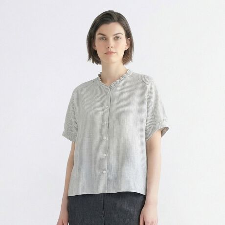 肌にさらっと心地よく着られるリネン100%素材のブラウスです。これからの季節にぴったりの爽やかなストライプ柄、顔まわりをすっきりと見せてくれるバンドカラーはフリルで大人可愛くおめかししました。ふんわりボリューム感を持たせた袖もポイント、ワンピースやジャンスカのインナーとしてもおすすめです。