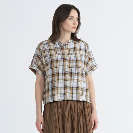 肌にさらっと心地よく着られるリネン100%素材のブラウスです。これからの季節にぴったりなマドラスチェック柄、顔まわりをすっきりと見せてくれるバンドカラーはフリルで大人可愛くおめかししました。ふんわりボリューム感を持たせた袖もポイント、ワンピースやジャンスカのインナーとしてもおすすめです。