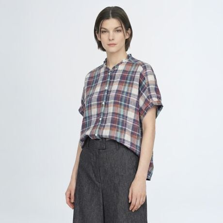 肌にさらっと心地よく着られるリネン100%素材のブラウスです。これからの季節にぴったりなマドラスチェック柄、顔まわりをすっきりと見せてくれるバンドカラーはフリルで大人可愛くおめかししました。ふんわりボリューム感を持たせた袖もポイント、ワンピースやジャンスカのインナーとしてもおすすめです。