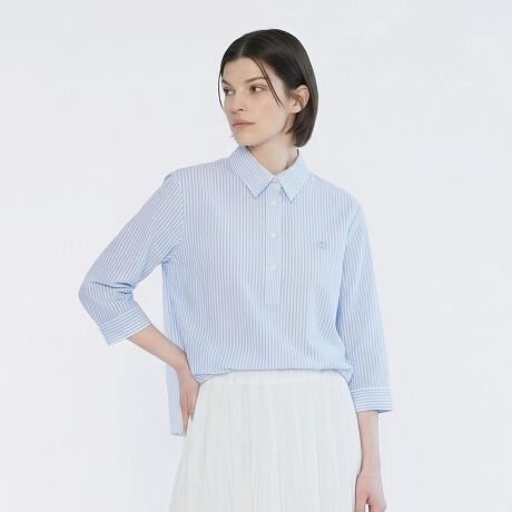 肌にさらっと心地よく着られるリネン100%素材のシャツです。これからの季節にぴったりの爽やかなストライプ柄、手首がのぞく7分袖でロングシーズンお使いいただけます。ハーフボタンがトレンド顔な着こなしをかなえてくれるポイント、きれいめとカジュアルのどちらにも着まわせる欲張りなアイテムです。