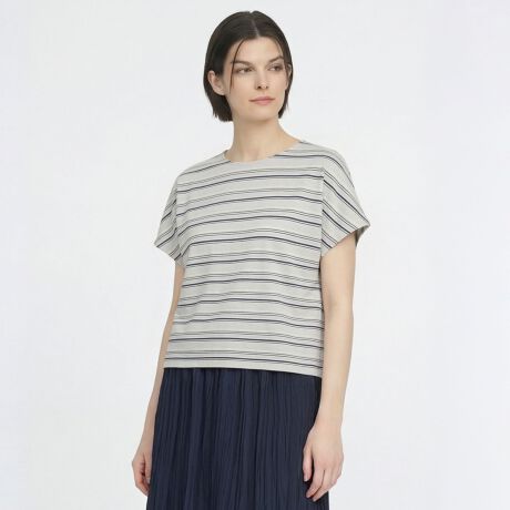 これからの季節にぴったりなマルチボーダー柄の半袖カットソーです。さりげないラメ混のボーダーラインに注目、袖に切り替えを作らないデザインが柄をきれいに見せてくれます。フレンチスリーブが脱カジュアル着こなしをかなえてくれるポイント、1枚着はもちろんインナーとしても存在感を発揮するアイテムです。