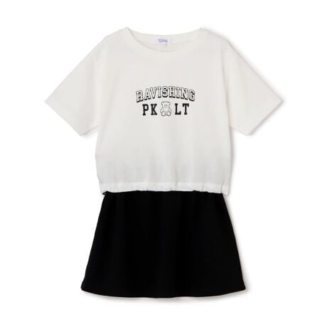 くまちゃんのプリントがポイントになったセットアップです。トップスは裾にドローコードが入っており、絞ったシルエットにすることも可能。スカートはウエストゴム仕様で、内側に取り替え口がついています。