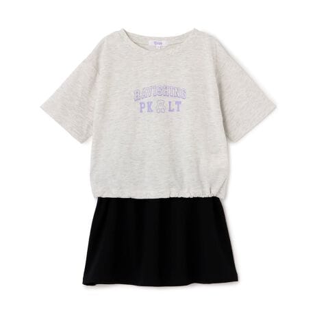 くまちゃんのプリントがポイントになったセットアップです。トップスは裾にドローコードが入っており、絞ったシルエットにすることも可能。スカートはウエストゴム仕様で、内側に取り替え口がついています。