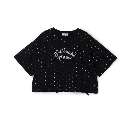 裾にレースアップデザインをプラスしたTシャツです。カジュアルでガーリーなコーデにピッタリ! トレンドのドット柄と無地のアソート展開になっています。短丈でコンパクトな今っぽいシルエット。