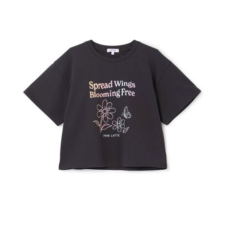 グラデーションプリントになったロゴデザインとフラワーモチーフが目を引くTシャツです。1枚でも存在感がある大きめのグラフィックが魅力。