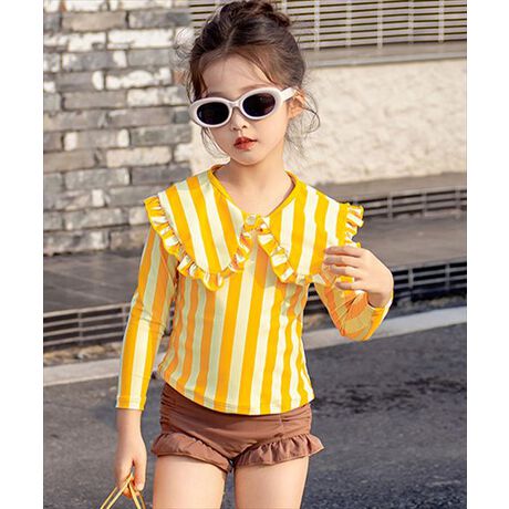 レトロガーリーなストライプとフリル付きビッグカラーが可愛いキッズ水着3点セット。