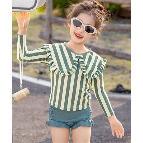 レトロガーリーなストライプとフリル付きビッグカラーが可愛いキッズ水着3点セット。
