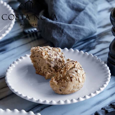 プレートのエッジにポコポコとついた丸い飾りが、パールをあしらったようでロマンチックなブレッドプレート。ちょっとした小皿がほしいときに便利にお使いいただけるサイズです。さりげなくエレガントなデザインで、日常使いにもぴったり。〈シリーズ〉18・19世紀のヨーロッパの陶器のデザインにインスパイアされたパールシリーズ。パールのような丸い形のビーズが、お皿のまわりを飾るエレガントなデザイン。時代の流行に左右されないヨーロピアンエレガンスとほどよいカジュアルさがミックスされた、日常に使いやすいシリーズです。コスタ・ノバのストーンウェア(?b器)は、デザインだけではなく、機能性にも優れています。電子レンジや食洗機にも対応し、気泡が少ないためお料理や食器を洗う水分がしみこみにくく、傷つきにい・割れにくいという特性を持っています。日常使いのお皿として、耐熱性や丈夫さを兼ね備えた使いやすさが大きな魅力です。陶器のような温かみ、機能性は、長く使ううちにその魅力をより実感していただけるでしょう。〈注意事項〉手作業の工程が入ることで一つひとつ表情が異なるのが魅力の商品です。釉薬のかかり方の違い、模様・色味の違い、表面の細かい傷・黒点・ピンホール等がみられることがございます。
