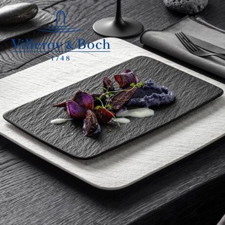 ロックはとても特別なシリーズです。顔料を練りこんだ特別な素材、釉薬を使いながらもマットに仕上げた表面、そして表情豊かなブラックカラーが象徴的で、トレンドのスレートのような見た目と感触が卓越した逸品に昇華させています。洋食器は丸くなくてはならないという概念を覆した一枚で、ロックはあらゆる角度から型破りなアイディアを実現しています。長方形でフラットな一枚は、オードブルやおつまみ、焼き魚などのメインディッシュ、デザートまで、料理を引き立ておいしそうに見せてくれる優れものです。贈り物としても人気です。