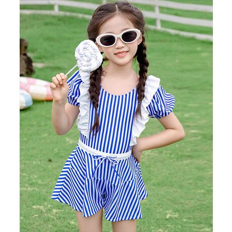 ブルーのストライプが夏らしい肩元のフリルが映えるデザイン