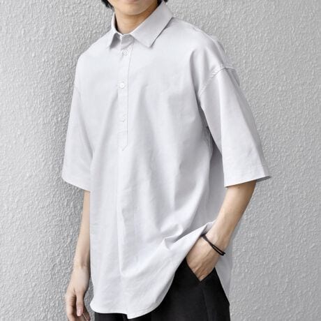リラックス感のあるレギュラーカラーデザインで、フロントにワンタックアクセントを入れたプルオーバー型の半袖シャツ。