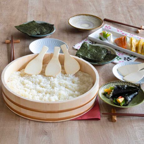 ●お寿司を囲んでパーティを楽しめる、木製の寿司桶としゃもじのセットです。