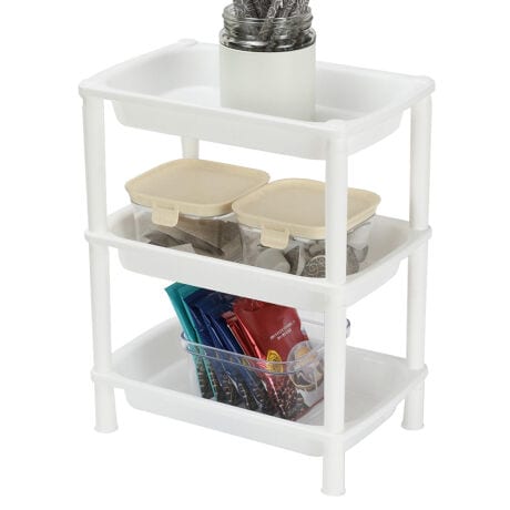 [型番:474689]【デザイン】●キッチンカウンターやコンロ奥のスペースを利用して小物を収納できる3段シェルフです。●オープンタイプなので調理中ても使いたい時にすぐに手に取ることができます。●深さのあるバスケット形状なので、収納した物が落下するのを防いでくれます。【スペック】サイズ/約幅27.5×奥行17.5×高さ33.5cm重量/約310g内容量/1台材質/ポリプロピレン生産国/日本製耐熱温度/100度耐荷重/約2kg(1段あたり)