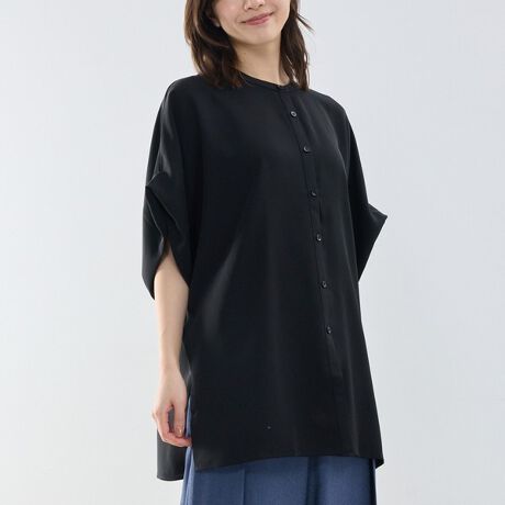 2025SSをブラッシュアップしたシリーズから、テントラインが魅力的なブラウスが登場。昨シーズンと同様の生地を使用し、とろみのあるしなやかな風合いを楽しめるデザインに仕上げました。バンドカラーのデザインがすっきりとした首元を演出します。程よく落ち感のあるボリュームとサイドスリットが軽やかな印象をプラス。ワイドパンツと合わせれば、大人のリラックススタイルを楽しめるアイテムです。