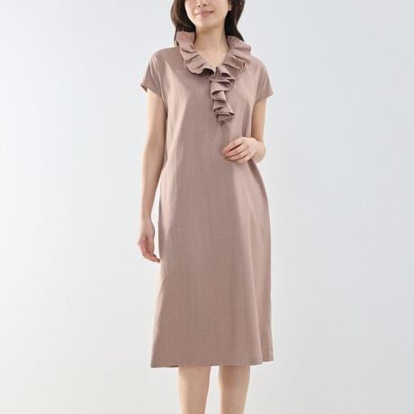 フリルが施されたネックラインがエレガントなムードを放つワンピース。フレンチスリーブのように落ち感のある袖が女性らしく、やさしい印象を与えます。小物類を収納できるサイドポケット付きがポイント。バックの裾にはスリットをあしらっているので、快適な着心地を実現します。1枚で休日のお出かけスタイルが完成するアイテムです。