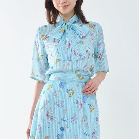 『summer sea』夏の海がテーマのジーニアスコラボからボウタイブラウスが登場。海に住む生き物、その仲間を落とし込んだPOPなイラストをアレンジしたオリジナルプリントです。生地は抜け感のあるストライプサテン生地を使用。シンプルな半袖シャツタイプに、さりげなく襟・前立て・袖口部分に無地サテンを合わせてアクセントに。