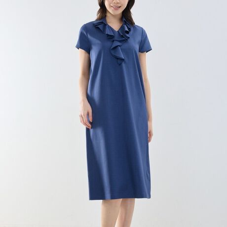 ひらりと揺らめく襟元のフリルが顔周りを華やかに演出するワンピース。すとんとした細身のシルエットになっており、縦のラインを美しく見せてくれます。バックの裾に施されたスリットがさりげない抜け感をプラス。小物類を収納できるサイドポケットがあしらわれています。1枚で着用するのはもちろん、ジャケットとレイヤードしたコーディネートも楽しめます。