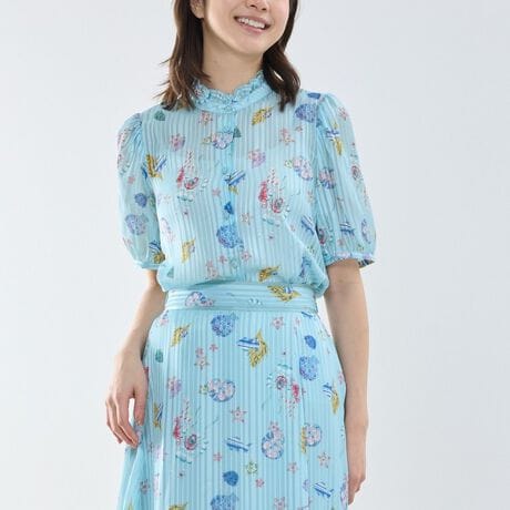 『summer sea』夏の海をテーマにしたジーニアスコラボから半袖ブラウスが登場。海に住む生き物とその仲間を落とし込んだイラストをアレンジしたオリジナルプリントです。涼しげな生地に夏の海を彷彿とさせるプリントを施し、POPなデザインに仕上げています。抜け感のあるストライプサテン生地を使用。襟元にさりげないフリルを施して甘さをプラスしたアイテムです。
