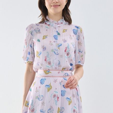 『summer sea』夏の海をテーマにしたジーニアスコラボから半袖ブラウスが登場。海に住む生き物とその仲間を落とし込んだイラストをアレンジしたオリジナルプリントです。涼しげな生地に夏の海を彷彿とさせるプリントを施し、POPなデザインに仕上げています。抜け感のあるストライプサテン生地を使用。襟元にさりげないフリルを施して甘さをプラスしたアイテムです。