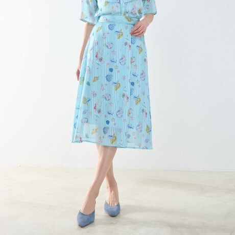 『summer sea』夏の海をテーマにしたジーニアスコラボのスカート。アシンメトリーにドレープを作り、巻きスカート風に見せたデザインが魅力的。海に住む生き物、その仲間を落とし込んだPOPなイラストをアレンジしたオリジナルプリントを施しています。抜け感のあるストライプサテン生地を使用。背面のウエストはゴム仕様で快適な着心地を演出します。