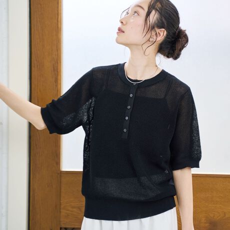 程よい透け感のあるワッフル編みとヘンリーネックで、シンプルながらこなれた印象に。