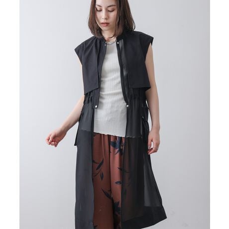 トレンド感のあるガンフラップデザインがアクセントになったロングジレ。シアー素材の軽やかな透け感が、羽織るだけで洗練された印象を演出します。縦のラインを強調するロング丈シルエットで、スタイルアップ効果も期待できる一枚。ウエストのドロスト仕様でシルエットに変化をつけられ、幅広いスタイリングに対応できるのも魅力です。