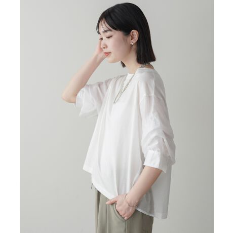 ふんわりと体を包み込む、やさしいシルエットのプルオーバー。気になるラインを自然にカバーしながら、リラックス感のある着こなしが叶います。袖にはタックを入れ、シンプルな中にさりげない華やかさをプラス。さらに脇部分には透け感のある異素材を使い、軽やかで涼しげな印象に仕上げました。一枚で“普通すぎない”大人の抜け感が手に入るアイテムです。