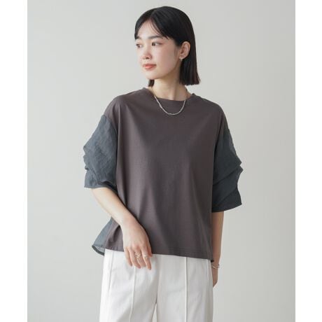 本体は綿100%で、やわらかく肌なじみの良い着心地。別布には、なめらかで軽やかな再生繊維(セルロース)を使用し、ほんのり透ける表情が魅力です。暑い季節も心地よく過ごせる、さらっとした素材感です。