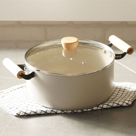 ●落ち着いたベージュカラーと天然木の組み合わせがおしゃれな、24cmサイズの両手鍋です。