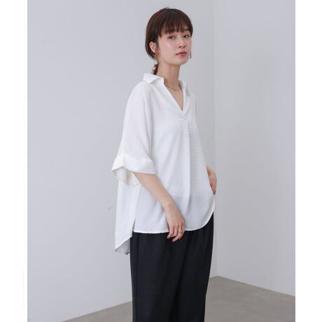 軽やかでやや表情のある素材感が特徴で、さらっとした肌触りが心地よい仕上がりです。通気性が良く、ゆったりとした着用感で暑い季節でも快適に過ごせます。柔らかく落ち感のある生地が、動きに合わせてきれいなシルエットを生み出します。