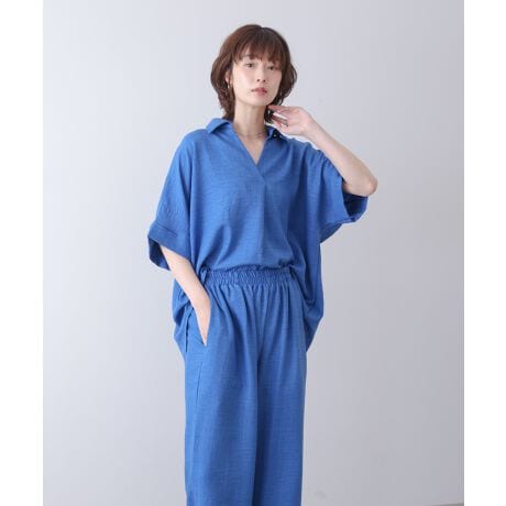 軽やかでやや表情のある素材感が特徴で、さらっとした肌触りが心地よい仕上がりです。通気性が良く、ゆったりとした着用感で暑い季節でも快適に過ごせます。柔らかく落ち感のある生地が、動きに合わせてきれいなシルエットを生み出します。