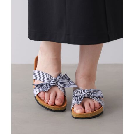 甲部分のリボンが華やかでカジュアルな大人サンダル。フラットな靴底で歩きやすく脱ぎ履きしやすいのもポイント。