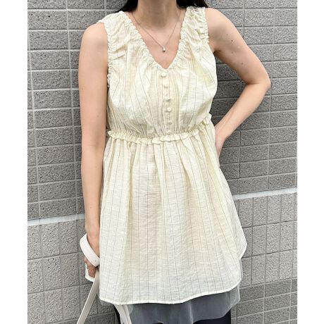 繊細なラメストライプがさりげなくきらめく、爽やかなチュニック。ウエストのギャザーがふんわりとしたシルエットを生み、女性らしい柔らかな印象に仕上げてくれます。首元のリボンディテールで華やかさをプラスでき、裾から覗くチュールがスタイリングに奥行きを与える一枚です。