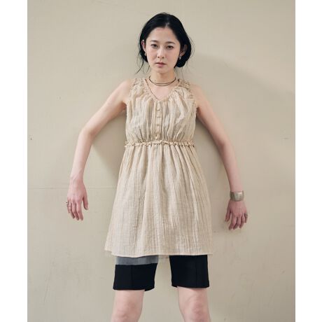 繊細なラメストライプがさりげなくきらめく、爽やかなチュニック。ウエストのギャザーがふんわりとしたシルエットを生み、女性らしい柔らかな印象に仕上げてくれます。首元のリボンディテールで華やかさをプラスでき、裾から覗くチュールがスタイリングに奥行きを与える一枚です。