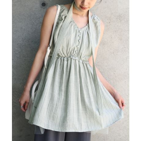 繊細なラメストライプがさりげなくきらめく、爽やかなチュニック。ウエストのギャザーがふんわりとしたシルエットを生み、女性らしい柔らかな印象に仕上げてくれます。首元のリボンディテールで華やかさをプラスでき、裾から覗くチュールがスタイリングに奥行きを与える一枚です。
