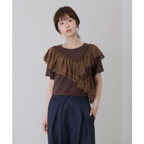 ソフトチュールを贅沢に使用したフリルデザインが目を惹くトップス。軽やかで柔らかいチュールが自然な落ち感を生み、大人っぽさと可愛らしさを絶妙にミックス。ギャザーをたっぷり寄せることで、動きのある華やかな表情に仕上げました。