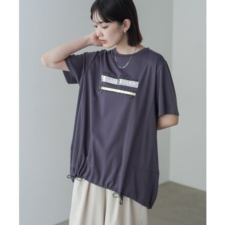 上品な箔風ロゴが目を引く、大人カジュアルにぴったりのデザインTシャツ。フロントのロゴがさりげないアクセントになり、シンプルながら一枚で着映えするアイテムです。ゆったりとしたシルエットで体のラインを拾いにくく、気になる腰まわりも自然にカバー。裾にはドロストコードを施し、絞ることでシルエットの変化を楽しめるのもポイントです。