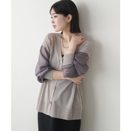 シャリ感のあるニット×ラメシアー袖の春夏カーディガン。ショート丈でプルオーバー風に着たり、真夏の冷房対策などにもオススメ。