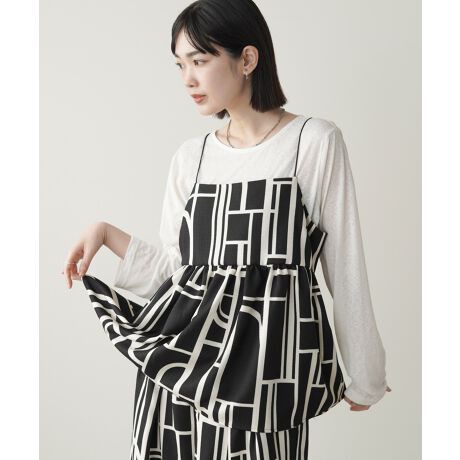 モノトーンでまとめた幾何学柄が、シンプルなのにしっかり印象に残る一枚。華奢な肩ひもが女性らしさを引き立て、バックはリボンで結ぶデザインにすることで、後ろ姿まで抜かりない仕上がりに。ウエストからふんわり広がるペプラムシルエットは、お腹まわりを自然にカバーしながら、軽やかな動きをプラスしてくれます。インナーを合わせるだけで、こなれたレイヤードが完成。